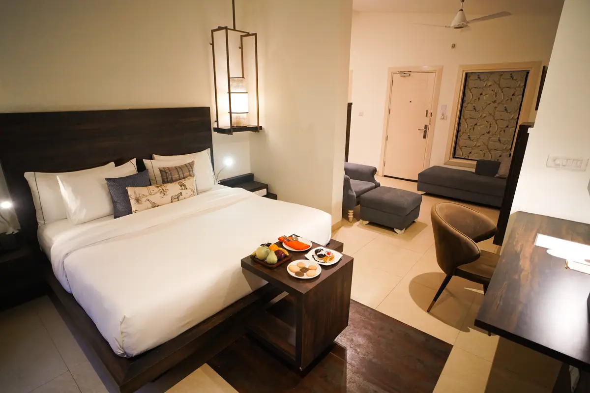 The cottage also includes a back yard sit out for that extra comfort and bonfire evenings enjoyed with the dearest ones. Offering top end luxury in the midst of a dense forest like in room mini bar, luxurious mattresses, maharaja sofa sittings, working desk, bed side reading lights, spacious wardrobes and romantic interiors makes the cottage a must stay for both luxury as well as corporate traveller. The shower panel in the bath provides the comfort of a steamy feel along with the mist effect that creates a sense of mystery while taking a bath. The shower cubicle is designed in a way that offers the wildness of raw pebbles to the comforts of granites, with water sprinkling from all sides. It is an experience worth taking during the stay in the wilderness of Solluna, Jim Corbett National Park.
